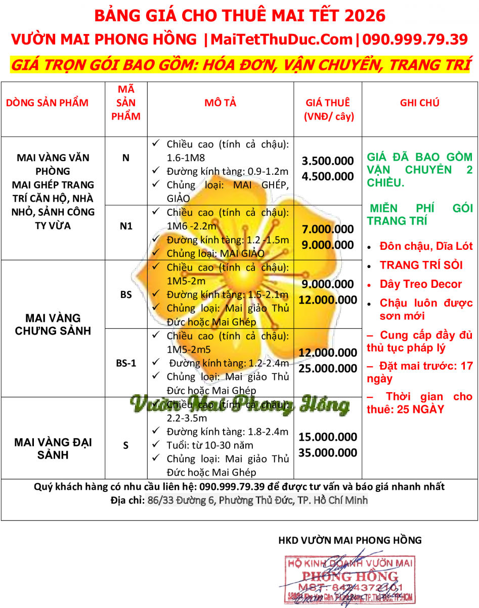 BẢNG GIÁ CHO THUÊ MAI TẾT 2026